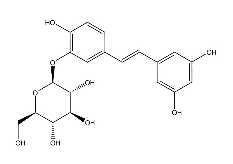 【英文别称】 (2S,3R,4S,5S,6R)-2-(5-((E)-3,5-dihydroxystyryl)-2-hydroxyphenoxy)-6-(hydroxymethyl)tetrahydro-2H-pyran-3,4,5-triol