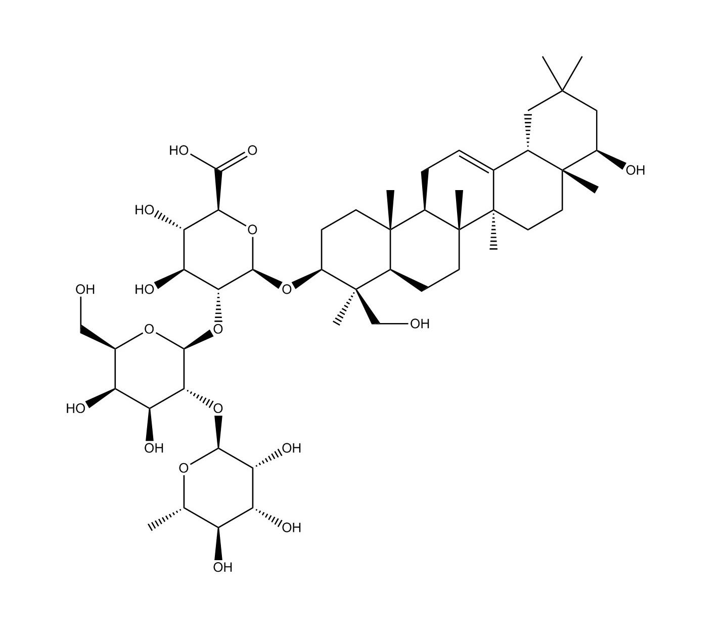 【英文别称】 β-D-Glucopyranosiduronic acid, (3β,4β,22β)-22,23-dihydroxyolean-12-en-3-yl O-6-deoxy-α-L-Mannopyranosyl-(1→2)-O-β-D-galactopyranosyl-(1→2)-